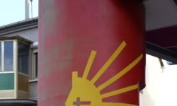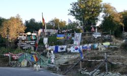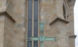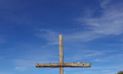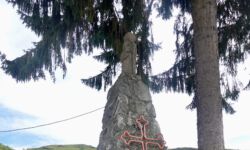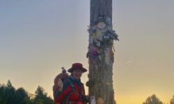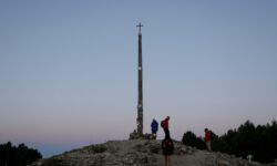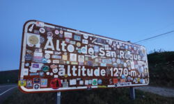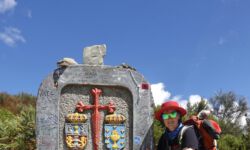 Das Eisenkreuz oben am Berg ist umgeben von einem riesigen Steinhaufen, auf dem Zitate von anderen Pilgern stehen. Hier kann man einen von zu Hause mitgebrachten und beschrifteten Stein ablegen und damit alles Negative hinter sich lassen. Ich bin froh, dass ich zusätzlich zum schweren Ruxsack nicht noch einen Stein mitgeschleppt habe. Daher mache ich nur ein Foto und gehe weiter.