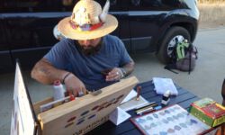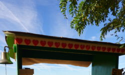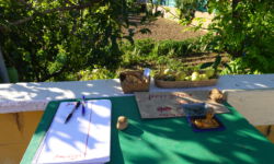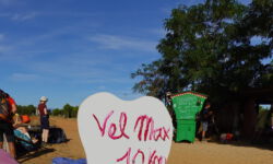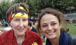 Wenige Kilometer weiter sitzt jemand an einem kleinen Tisch, der besondere Stempel in den Pass setzt. Es sind echte Siegel und man kann aus verschiedenen Motiven eines aussuchen. Sabrina entdeckt mich am Stand und freut sich, mich wiederzusehen. Géonne überlegt noch, welches Motiv sie wählen soll. Der Mann siegelt nicht nur das ausgewählte Motiv, sondern er bemalt das Siegel auch noch. Eine kleine Spendenbox steht auf dem Tisch und jeder wirft etwas hinein. Das alles dauert nicht lange, denn wir möchten ja gerne weiterwandern.