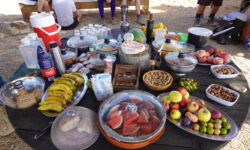 Das Wetter ist heute wirklich optimal zum Wandern. Es ist nicht zu heiß, die Wege sind schön und man trifft ab und zu andere Pilger. Die kommen aus Italien, USA, Australien, Spanien, Belgien, Schweden oder sonst woher. Caminosprache ist daher Englisch. Oben am Berg befindet sich plötzlich ein schönes Lager. Da stehen Betten, es hängt eine Schaukel da und es gibt gemütliche Sitzgelegenheiten. Außerdem steht da ein großer Tisch mit Obst und Nüssen und es gibt Getränke. Alle Pilger dürfen sich gegen eine kleine Spende bedienen. Ich bin froh, wenn mein kleiner Fressbeutel etwas leichter wird, aber ich spende gerne für die schöne Sitzgelegenheit und treffe auch noch Remy und Géonne wieder. So allmählich finde ich mich ein in der Pilgergemeinde und es macht viel Spaß auf dem Camino, auch wenn die Knochen oder Füße schmerzen.