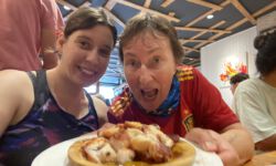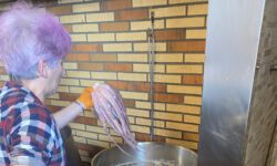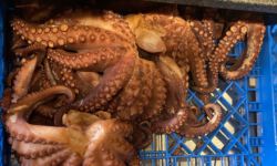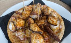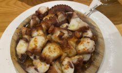 Die Pulperia Ezequiel in Melide ist heute unser erstes Ziel. Melide ist berühmt für die besten Kraken in ganz Spanien und Guillermo kennt die beste Pulperia dort. Ich bin früh da und kann erst einmal der Köchin über die Schulter schauen. Sie wirft die Kraken aus einem großen Eimer in riesige Kochtöpfe. Ihre Haare haben die gleiche Farbe wie die Kraken. Sie kocht die leckeren Tiere und schneidet sie anschließend klein. Dann kommen die Stücke mit Paprikapulver auf einen Teller. Es ist sehr heiß hinter ihrer Theke und die Arbeit erscheint mir nicht leicht zu sein. Nach und nach füllt sich die Pulperia und die Fangarme liegen schön zerteilt auf den Tellern. Pulpo a la feira: es schmeckt fantastisch!