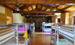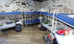 Angekommen in Portomarin sind einige, so wie ich, in der Albergue Ferramenteiro. Wir schlafen in einem Saal mit 130 Leuten zusammen. Vom Bett aus habe ich einen schönen Blick durch viele Betten hindurch. Am Nachmittag legen die meisten ihre Füße hoch und ruhen sich aus! Es ist überall topsauber und gut organisiert. Es gibt sogar eine Küche mit Blick auf den Fluß.