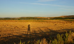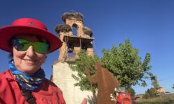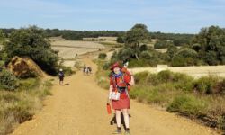 Es geht heute über lange Strecken über steinigen Lehmboden, der rot ist wie der Boden in Australien. Nicht gut für meine Blase unterm Fuß, dafür sehr schön fürs Auge. Hinter der näxten Kurve sehe ich einen Schatten hinter mir und drehe mich um. Der gehört passenderweise zu einer Australierin, die in Melbourne wohnt. Sie erklärt mir, dass, wenn der Schatten immer kleiner wird und dann nicht mehr vor einem, sondern hinter einem liegt, auch alles Böse und alle Probleme hinter einem liegen. Darüber will sie ein Buch schreiben. Wird sicher ein Bestseller! Ich dachte immer, dass die Schattenbildung mit dem Stand der Sonne zu tun hat. Egal, sie ist ansonsten sehr nett und wir laufen eine Weile zusammen.