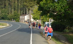 Es ist etwas regnerisch und wir holen unser Regenzeug hervor. So richtig lohnt es nicht, aber es tröpfelt doch immer mal wieder. Wir sind gespannt auf die einhundert Kilometermarke, die wir heute passieren. Manche freuen sich schon bei Kilometer 100,979 und machen dort Selfies. Ich weiß, dass es einen 100,00 Marker gibt. Also überholen wir die Selfiegruppe und gehen zum „richtigen“ Stein. Natürlich machen wir da dann ein Gruppenfoto.