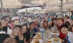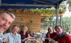 Nach dem Füßehochlegen gehen wir zu dritt zum Fluss, hängen die Füße ins kalte Wasser und treffen natürlich weitere Pilger. Von da aus gehen wir zusammen in ein Restaurant am Marktplatz und ruxzuck sind wir zu zwölft an einem Tisch. Jeder kennt einige aus der Gruppe. Mit Japanern, Italienern, Spaniern und Schweizern probieren wir den lokalen Wein und haben einen lustigen Abend zusammen. Wir verabreden uns sogar für eine bestimmte Albergue am Fluß, wenn wir in Arzua sind.