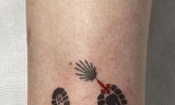 In Porto habe ich dann einen Tattoo-Artisten gefunden, der mit mir gemeinsam meinen ersten Entwurf verfeinert hat und sich viel Zeit für das Design genommen hat, bis es mir endlich sehr gefiel. Daher gibt es nun zwei kleine Fußabdrücke von Wanderschuhen mit einer Muschel und der Kathedrale von Santiago de Compostela auf meinem Bein. 🙂