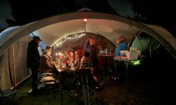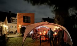 Den Silvesterabend verbringen wir mit den Nachbarn im heimischen Garten. Mit 13 Leuten und Butler James geht es nach dem obligatorischen Dinner for one ins Boickholtgrün unter den Eventshelter und das Feuer im Ölfass wärmt uns ein wenig auf. Da alle Camper sind, sind wir das Draußensitzen bei Wind und Wetter gewöhnt und mit der richtigen Kleidung und den richtigen Getränken wird es ein fröhliches Silvesterfest!