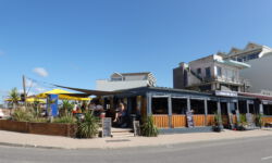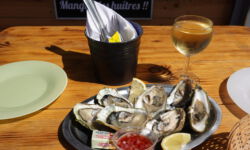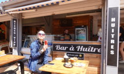 Wir fahren mit dem Fahrrad ins Dorf und setzen uns erst einmal auf die Dachterrasse vom Beachhouse. Die Aussicht ist grandios und die Getränke preislich ganz moderat. Also ein Spot zum Wiederkommen. Heute ist der Ort auch nicht so voll, auch am Strand liegen weniger Menschen. Einige Surferkarawanen mit Surfschülern gehen zum Meer. Wir schlendern durch den Ort und finden sogar einen Austernstand, an dem ich ein paar Tierchen mit Zitronensaft und einem Glas Weißwein schlürfen darf.
