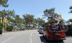 Der Campingplatz, auf dem wir sonst immer standen, ist erwartungsgemäß ausgebucht. Also suche ich wieder nach einem Stellplatz für einige Nächte. Den gibt es auch, direkt zwischen Hubschrauberlandeplatz und Hauptstraße. Hört sich ziemlich ruhig an, die Bewertungen bestätigen meine Vermutung. Leider kann man den Platz nicht reservieren, aber als ich ankomme sind noch genügend Plätze frei und ich finde einen schönen im Halbschatten unter hohen Pinien. Einen Haken hat der Platz jedoch: Es gibt kein Klo, dafür Wasser und Strom. Gut, dass ich ein Notklo an Bord habe, jetzt nützt es mir zum ersten Mal etwas.