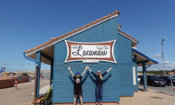 Auf dem Rückweg zum Campingplatz machen wir die Traditionsfotos vorm blauen Haus des Lacanau Surf Clubs. Die Sonne steht gut und wir wechseln uns ab. Nur für das Foto mit uns beiden zusammen suchen wir einen Fotografen. Ich stelle mich an die richtige Position, stelle die Kamera ein und dann muss der gefundene Laienfotograph nur noch aufpassen, dass er das blaue Haus GANZ im Bild hat. Eine total einfache Anweisung, denken wir. Wir stehen vorm blauen Haus und reißen die Arme hoch.