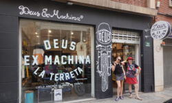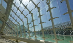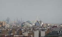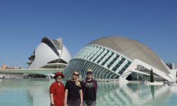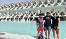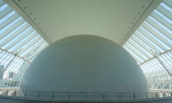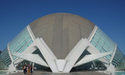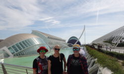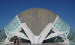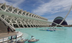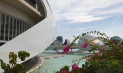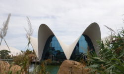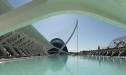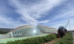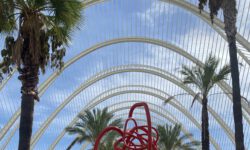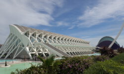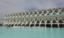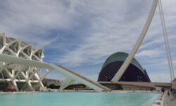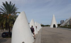 Am näxten Tag geht es vom Campingplatz aus mit einem öffentlichen Bus in die Stadt. Wir laufen vom Plaça de la Porta de la Mar zuerst zum Levante Union Deportiva Store und kaufen einen neuen Schal für meinen Fußballschalsammlerkollegen Hagi. Danach sehen wir uns den Mercado Colón und den Deus Ex Machina Store an, bevor wir einen Fußmarsch durch ein trockenes Flussbett bis zum eigentlichen Tagesziel, der Ciutat de les Arts i les Ciències, der Stadt der Künste und Wissenschaften, machen. Dieser Wissenschaftspark ist ein Werk des Architekten Santiago Calatrava, der unter anderem auch schon in Oviedo und New York City gewirkt hat. Er besteht aus mehreren weißen Gebäuden mit sehr stylischer Architektur und ist eine Wohltat für‘s Auge. In die Gebäude kann man, zum Teil mit Eintrittskarte, hineingehen und sich umsehen, was sich sehr lohnt.