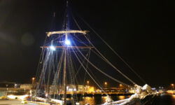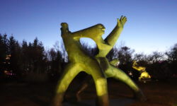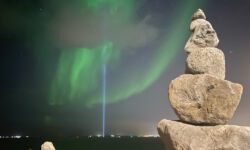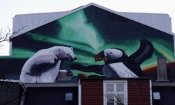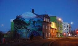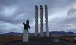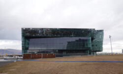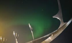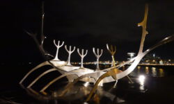 Wir laufen erst einmal zur Wikingerskulptur an der Küstenstraße. Dort waren wir am ersten Tag unserer Islandreise noch gar nicht. Der Tag ist klar und wir haben wieder Glück mit dem Magnetismus am Himmel. Wir sehen verschiedene Polarlichter, die sich am Himmel bilden. Durch das Licht in der Stadt erscheinen sie nicht ganz so kräftig, aber sie sind gut zu erkennen. Die Leute um uns herum laufen wie Hans-Guck-In-Luft durch die Gegend, weil sie entweder ein Polarlicht erhoffen oder gerade eins zu sehen ist. Wir gehen weiter bis zum Konzerthaus und Kongresszentrum. Das Design des Hauses gefällt uns.