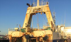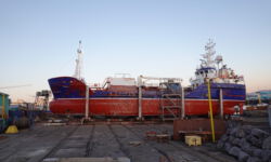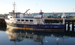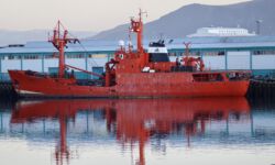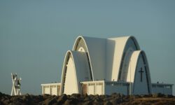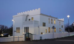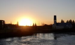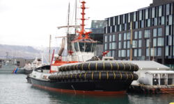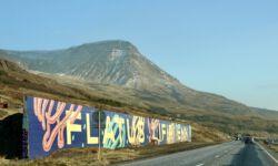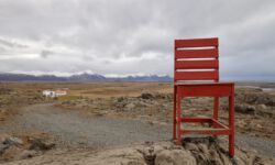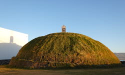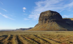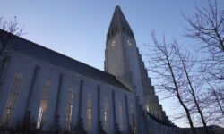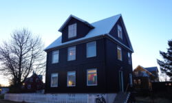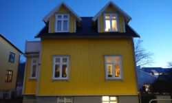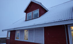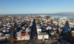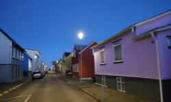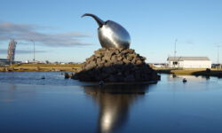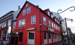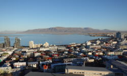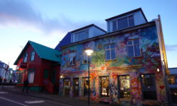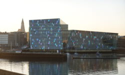 Am nächsten Morgen müssen wir den Dacia Duster wieder abgeben. Die Abgabestation ist am Flughafen in Reykjavik und nur zwei Kilometer von unserer Unterkunft entfernt. Nach der Abgabe spazieren wir zu Fuß zurück in die Stadt und laufen erst einmal zum Hafen. Die Hallgrimskirka und die Häuser liegen noch etwas im Dunklen. Am Hafen liegen Fischtrawler und ein Löschschiff im Wasser. Wir laufen bis zum Kunstwerk von Olöf Nordal, einem Grashügel mit einem kleinen Holzhäuschen obendrauf, das hier seit 2013 steht. Man kann den Hügel herauflaufen und hat eine schöne Rundumsicht über den Hafen mit dem Konzerthaus und Kongresszentrum.