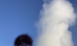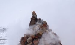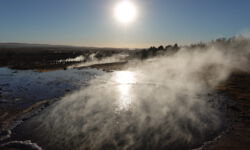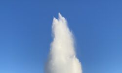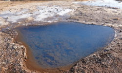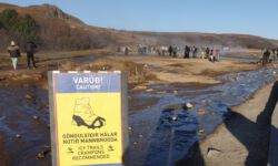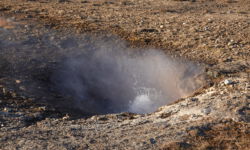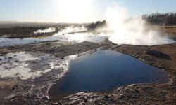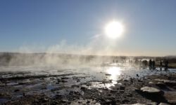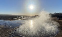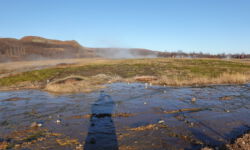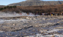 Weiter geht es zum Geysir Strokkur, der alle fünf bis sieben Minuten eine bis zu fünfzehn Meter hohe Wassersäule ausspuckt. Rund um den überaus aktiven Strokkur brodelt und dampft es an vielen Stellen und heißes Wasser blubbert aus dem Boden. An gefährlichen Stellen ist ein Strick gespannt, um die Besucher vor schlimmen Verbrühungen zu schützen, aber ansonsten können wir uns dort frei bewegen. Die Wasserfontäne des Strokkur, die immer ganz plötzlich aus dem Boden schießt, finde ich so beeindruckend, dass ich mich sehr lange dort hinstelle und die Ausbrüche immer wieder beobachte.