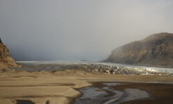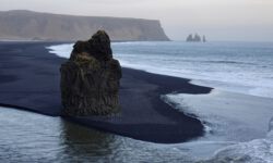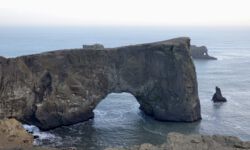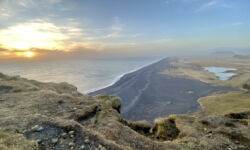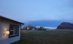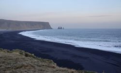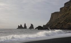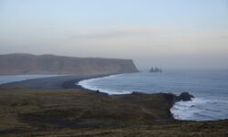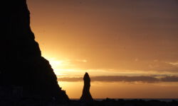 Der zehn Kilometer lange Gletscher Sólheimajökull ist unser näxtes Ziel. Die Eisbrocken, die von Zeit zu Zeit abfallen, rutschen in einen Gletschersee und schwimmen dort umher. Kurz vor Vik i Myrdal machen wir noch einen Abstecher zum südlichsten Punkt Islands: dem Kap Dyrhólaey. Dort steht der imposante 120 Meter hohe Türlochfelsen, wie Dyrhólaey übersetzt heißt. Gegenüber liegt ein sehr langer schwarzer Sandstrand, der an einer bizarren Felsformation endet, die sich im Wasser befindet. Da es den ganzen Tag saukalt draußen ist, freuen wir uns nun auf unsere neue Unterkunft in Vik i Myrdal.