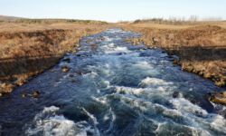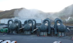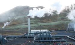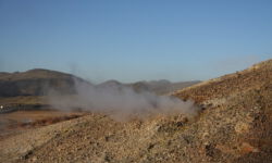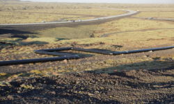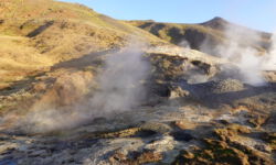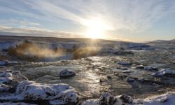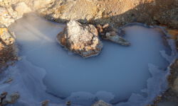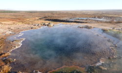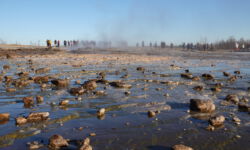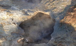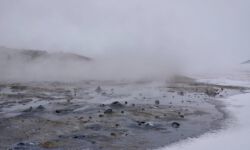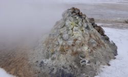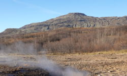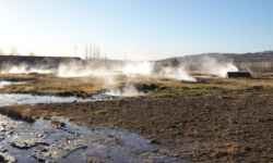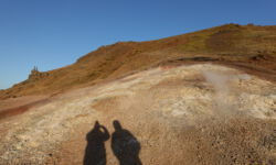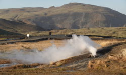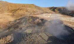 Auf dem Weg dahin halten wir zuerst in Hellisheidi am Geothermiekraftwerk, das den ganzen Großraum Reykjavik mit Energie versorgt. Strom und Heizwärme werden erzeugt, indem kaltes Wasser auf eine Tiefe von 2000 Metern gepumpt wird und sich durch das dort vorhandene heiße Vulkangestein erhitzt. Ganz in der Nähe können wir über ein paar Stege durch ein kleines Lavafeld laufen, in dem es lauter blubbernde und dampfende Löcher gibt, aus denen es ordentlich nach Schwefel stinkt. Aber es sieht einfach faszinierend aus.
