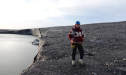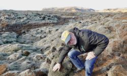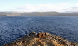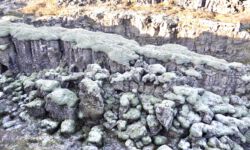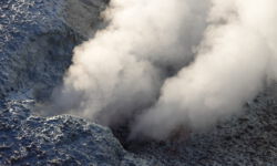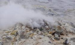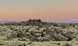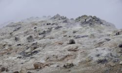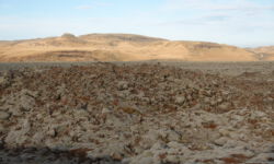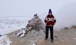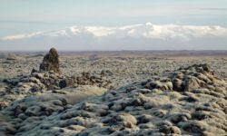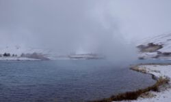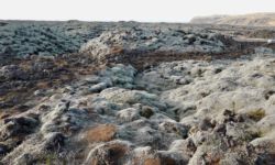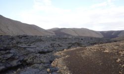 Weiter geht es durch einen Tunnel auf die andere Seite des Fjordes Hvalfjördur und weiter an Reykjavik vorbei bis zur Halbinsel Reykjanes. Dort gab es 2021 und 2022 bereits Vulkanausbrüche, bei denen Lava in die umliegende Landschaft floss. Diese Gebiete kann man nun erwandern und an den Lavafeldern vorbeilaufen. Zum größten Teil ist die Lava erloschen, aber an manchen Stellen dampft es noch ordentlich, so dass empfohlen wird keinesfalls auf die Lava zu treten. Bricht diese poröse Kruste, dann kommt man mit dem Fuß in bis zu 1200 Grad heiße Lava. Wir halten uns an die Empfehlung und laufen nur ein bisschen am Rand des Ausbruchsgebietes umher. Beeindruckend ist die Größe der Fläche, die von der Lava eingenommen wird.