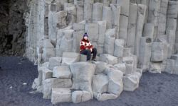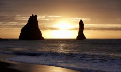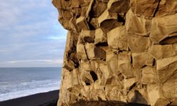 Nach dem Frühstück machen wir uns auf zum Reynisfjara, auch Black Beach genannt. Der ist nur wenige Fahrminuten von unserer Unterkunft entfernt und die Sonne ist eben erst aufgegangen. Am Black Beach gibt es nicht nur einen laaaaaangen schwarzen Strand, sondern auch besondere Lavasteinformationen im und am Wasser. Die Sonne leuchtet fantastisch zwischen den Felsen im Meer hindurch. Seevögel fliegen in Scharen über unsere Köpfe hinweg. Die eckige Felsstruktur passt sehr gut hierher.