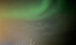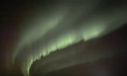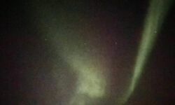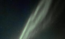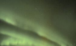 Nun fehlt nur noch eine Aurora Borealis. Es ist nicht bewölkt, daher wäre ein Nordlicht gut sichtbar, wenn es denn ausgerechnet hier und heute aufkreuzen würde. Als ich nach dem Abendessen aus dem Fenster sehe, schimmert es irgendwie merkwürdig am Himmel. Da ist so ein heller Streifen. Sofort renne ich mit meinem Handy in Schlappen aus dem Häuschen. Es ist eiskalt, aber das ist nicht so wichtig. Tatsächlich entwickelt sich aus dem hellen Streifen ein grünlich leuchtender Streifen. Der wird dann immer intensiver, er liegt wie ein grüner Regenbogen über der Wiese, auf der unser Häuschen steht. Das ist eine richtig schöne Aurora Borealis! Wow.