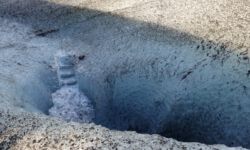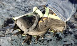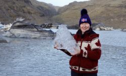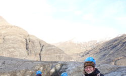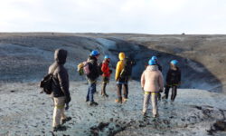Vom Parkplatz aus wandern wir bis zum Rand des Gletschers. Der Gletscher ist nicht schneeweiß sondern grau, weil vor zwei Tagen ein heftiger Wind Vulkanasche dorthin geweht hat. Als erstes schnallen wir uns sogenannte Crampons unter die Schuhe. Die haben böse Metallzacken unter sich, die sich beim Gehen auf dem Eis festkrallen. Mit den richtigen Anweisungen von unserem Guide und nach ein bisschen Übung stapfen wir über den Gletscher. Wir sehen viele kleine und große Eislöcher, über die wir drüber oder drumherum laufen können und wir gehen sogar durch ein großes Loch mit einem Schmelzwasserbach hindurch. Nur hineinfallen in die tiefen Löcher und fünfhundert Jahre später wieder ausgespuckt werden, möchten wir natürlich nicht. Also passen wir gut auf.