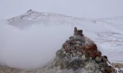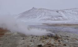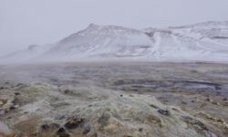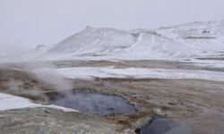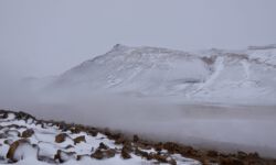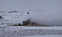Die Straße ist tatsächlich befahrbar, aber es gibt Schneeverwehungen, die wirklich merkwürdig aussehen. Der Schnee fegt in Streifen über die Straße hinweg und bleibt oftmals gar nicht liegen. Links und rechts der Straße liegt aber Tiefschnee. An anderen Stellen liegt zwar Schnee auf der Straße, aber er ist zum Glück nicht allzu tief. Wir kommen wider erwarten gut voran und halten kurz vor Reykjahlid am Geothermalfeld Hverir an.