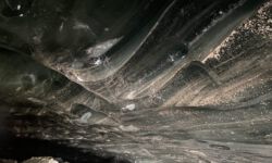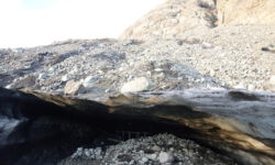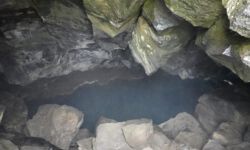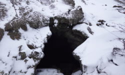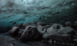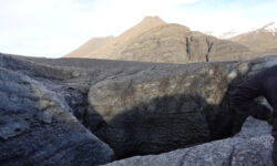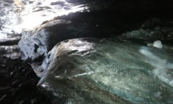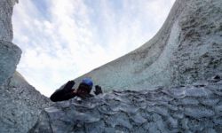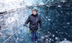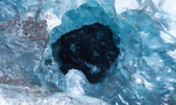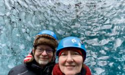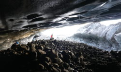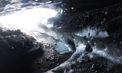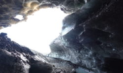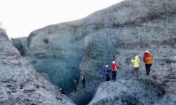 Wieder oben wandern wir den Gletscher abwärts bis zum Rand. Da ziehen wir unsere Crampons aus und bekommen Minispikes. Die sind nicht ganz so zornig gebaut und genügen für unseren Trip in eine große Gletscherhöhle. Sie sieht nicht so spektakulär aus und wir müssen nicht runter gehen sondern gelangen über einen Eingang von einer Seite hinein. Es ist sehr dunkel innen, weil nur wenig Licht durch die dicke Eisschicht dringt. Wir müssen sogar kriechen, um wieder in einen Bereich zu gelangen, in dem man stehen kann. Über uns und um uns herum ist überall Eis. Wir hoffen, dass es heute hält und nicht ausgerechnet jetzt zusammenbricht. Ab und zu kommt etwas Licht durch Eislöcher von oben in die Höhle und natürlich haben auch einige aus der Gruppe Lampen dabei, so dass man dann das Eis gut erkennen kann. Wir sind schwer beeindruckt.