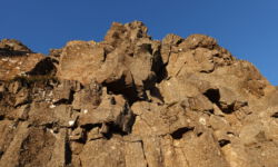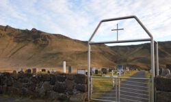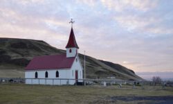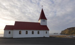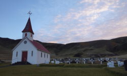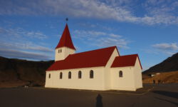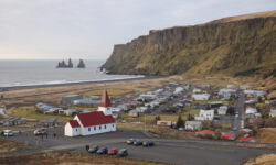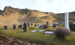 Wir fahren weiter in den Ort Vik i Myrdal. In diesem kleinen 600 Seelen-Ort steht die Kirche, Reyniskirkja, oben auf einem kleinen Berg, neben an befindet sich direkt der Friedhof. Von hier oben hat man eine schöne Aussicht auf den schwarzen Reynisfjara-Strand mit der Reynisdranger-Felsformation. An den Klippen des Reynisfjall-Berges leben Meeresvögel, darunter auch der für Island berühmte Papageientaucher. Den sehen wir zwar nicht, aber es fliegen Vogelschwärme oben am Berg entlang.