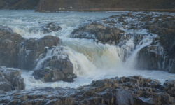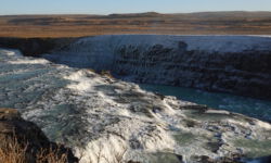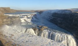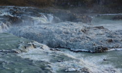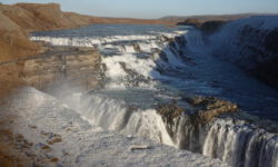Aber hier, wie überhaupt, kommt es anders als man glaubt. Schon vom Parkplatz aus hören wir das Wasser rauschen, als wenn wir zu einer stark befahrenen Autobahn spazieren wollten. Und dann sehen wir den Gullfoss, wie er auf einer Breite von über 200 Metern riesige Wassermengen in die Schlucht fallen lässt. Das ist ein wahrhaftig imposantes Schauspiel und ich bin schwer beeindruckt. Insbesondere das Bilden von Schnee und Eis am Rand der Fälle habe ich noch nie gesehen, da ich Wasserfälle bisher nur in der warmen Jahreszeit angesehen habe. Wir laufen über die Wege am Gullfoss entlang, um immer neue Perspektiven zu erhalten und ich mache dort das eine oder andere Foto.