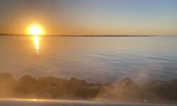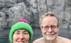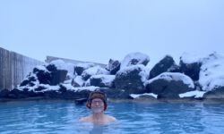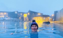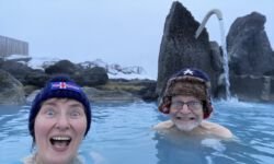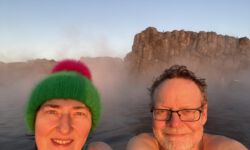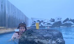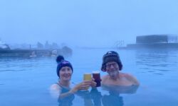 Anschließend fahren wir mit einem Bus zur Sky Lagoon. Das ist ein geothermisches Bad, das direkt am Meer liegt. Nicht zu verwechseln mit der Blue Lagoon, die aufgrund von Erdbeben und Vulkanausbruchvorhersagen gestern geschlossen wurde. Wir sehen den Sonnenuntergang aus dem warmen Wasser heraus. Abends beobachten wir wieder Nordlichter von unserem Balkon aus. Noch einmal in die Kälte laufen, um eine bessere Stelle zu erwischen, möchten wir heute aber nicht.