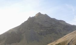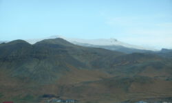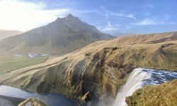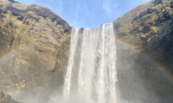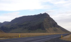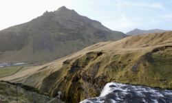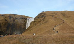 Dann fahren wir weiter zum Skogafoss-Wasserfall, der über 60 Meter in die Tiefe stürzt. In der dazugehörigen Schlucht gibt es über 20 weitere Wasserfälle, die wir aber nicht ansehen. Die Landschaft an der Ringstraße auf dem Weg zum Skogafoss wird immer grüner und bizarre Felsen liegen am Wegesrand. Wir sehen von weitem auch den eisbedeckten uns allen bekannten Eyjafjallajökull, der 2010 ausbrach und für mehrere Tage den Flugverkehr rund um Island aufgrund der heftigen Aschewolken zum Erliegen brachte. Nach dem Ausbruch des Eyjafjallajökull schoss nicht nur die Asche in die Höhe, sondern ebenso die Touristenzahlen auf Island. Wirtschaftlich sicherlich ein Segen für die Insel.