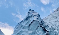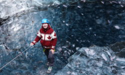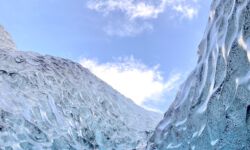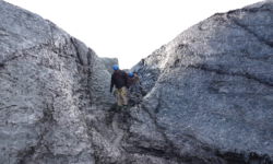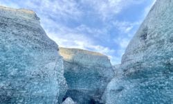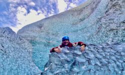Dann geht es weiter nach oben bis zu einer Gletscherspalte, in die wir von oben einsteigen. Es gibt zwar Stufen, die in das Eis hineingehackt wurden, aber die sind sehr schmal und auf einer Seite geht es zig Meter runter in das tiefe Loch. Zur Sicherheit haken wir uns mit unserem Bergsteigergeschirr an einem Strick ein, der uns im Zweifel das Leben retten kann. Wir sind vorsichtig und es passiert nichts, außer, dass wir unten in einer blau schimmernden Gletscherspalte landen, die wunderbar glänzt und irgendwie unecht aussieht. Fast wirkt sie ein bisschen kitschig, aber auch faszinierend, weil sie eben einfach nur aus Eis besteht.