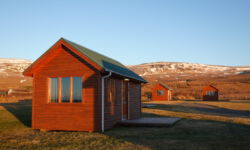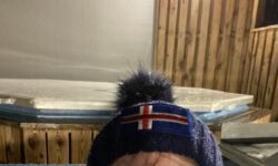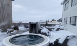 Ich recherchiere auf welcher Höhe sich Egilstadir befindet: 33 Meter über dem Meeresspiegel. Das Wetter hat also nichts mit der Höhe zu tun. Es ist ja bekannt, dass Island so seine eigenen Wetterkapriolen schlägt. Am selben Tag quasi vier Jahreszeiten zu erleben ist hier nicht ungewöhnlich. Nun bekommen wir einen ersten Eindruck davon. Nach wenigen Kilometern wechselt der Schneefall wieder in Schneeregen und die Straße ist nicht mehr weiß. Dann erreichen wir unsere Unterkunft. Hier gibt es zu meiner Freude ein warmes Wasserbecken auf der Terrasse. Das probiere ich doch gleich mal aus. Mit Mütze, weil die Schneeflöckchen immer noch vom Himmel rieseln.