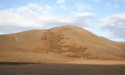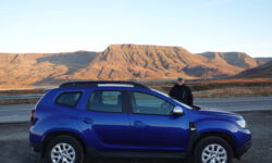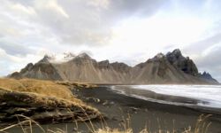 Auf dem Weg zum kleinen Parkplatz erfahren wir zum ersten Mal wieso der Leihwagenanbieter uns eine Versicherung gegen Sandstürme aufschwatzen wollte. Plötzlich fegt der schwarze Sand durch die Luft und wirbelt überall umher. Der Wind lässt schnell wieder nach, so dass wir zu Fuß weiter gehen können. Ich kann schöne Fotos mit den Sandhügeln im Vordergrund und den beiden Bergen Husadalstindur und Kambhorn im Hintergrund machen. Dann gibt es noch einmal einen heftigen Sturm, so dass wir den schwarzen Sand ins Gesicht gefegt bekommen. Wir müssen uns umdrehen und können auch die Autotür nicht öffnen. Zum einen, weil sonst die schwarzen Sandkörner ins Auto fliegen würden und zum anderen, weil wir die Türen kaum öffnen können. Nach zwei Minuten ist der Spuk wieder vorbei. Der Autolack sieht noch ganz OK aus und wird wohl nicht beanstandet werden.