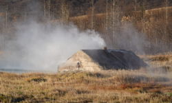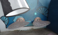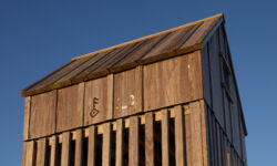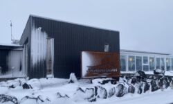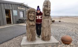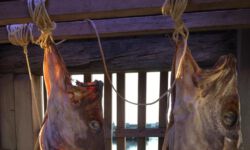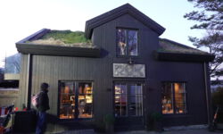 Ich linse mal durch die Holzstäbe dieses kleinen Häuschens und entdecke getrocknete Fische, aufgehängt an Schnüren. In der keimfreien, sauberen Luft des Nordens trocknen die Fische innerhalb weniger Wochen so weit aus, dass sie im Wind klappern. Der Fisch ist dann so hart, dass er nach alter Tradition vor dem Genuss mit einem Hammer oder einer Keule weichgeklopft werden muss. Ob diese Fische hier zum Kunstwerk gehören und schon seit zehn Jahren im Wind klappern oder noch gegessen werden, weiß ich nicht.