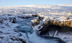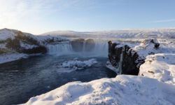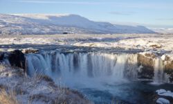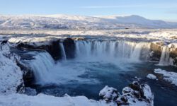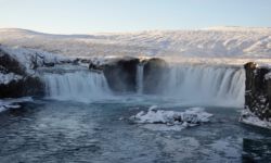 Wir fahren erst einmal um den Myvatn herum und durch eine schöne Winterlandschaft. Klaus muss ab und zu anhalten, damit ich Fotos machen kann. Dann geht es weiter bis zum Godafoss, dem Götterwasserfall. Das Wasser des Skjalfandafljot stürzt sich hier über einer Breite von 158 Meter etwa elf Meter in die Tiefe. Die Sonne scheint und beleuchtet die umliegenden Berge.