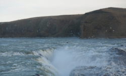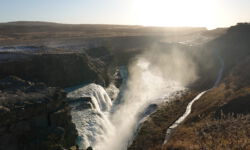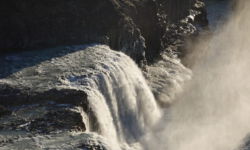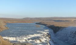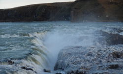 Wir fahren weiter zum Gullfoss, dem goldenen Wasserfall, der aus zwei Stufen besteht. Von der unteren Stufe aus fließt das Wasser in einen tiefen langen Graben. Ich freue mich immer noch über die schönen Fotos, die ich am Strokkur gemacht habe, so dass ich vom Gullfoss gar nicht so viel Spektakuläres erwarte. Außerdem kenne ich die Niagarafälle, die Viktoriafälle und die Iguacufälle, die alle so beeindruckend sind, dass ich mich frage, was da wohl Besonderes kommen mag.