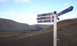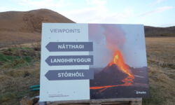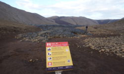 Auch in diesem Jahr gab es bereits Eruptionen im selben Gebiet. Der Litli-Hrutur-Vulkan ist seit dem 10. Juli aktiv und spuckt Lava in ein Gebiet etwas nördlich von den beiden aus den vergangenen Jahren. Es gibt Wanderwege zum Kraterrand, aber es dauert ungefähr zweieinhalb Stunden bis man dort ist. Außerdem wird in Kürze ein erneuter Ausbruch erwartet und den wollen wir nicht während der Wanderung dorthin erleben. Ich mag es zwar gerne warm, aber mehr als 1000 Grad finde ich doch zuviel. Zwei unserer Freunde haben uns schon gewarnt, dass ein erneuter Ausbruch bevorsteht und man sich in Island bereits auf mögliche Evakuierungen vorbereitet. Wir bekommen von all dem hier nichts mit. Im Gegenteil. Auf dem Parkplatz zum Vulkanwanderweg gibt es Hinweistafeln, welcher Weg wie weit ist und woher man laufen kann.