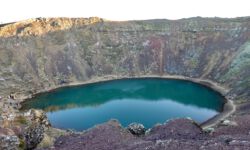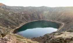 Der Kerid ist ein 55 Meter tiefer Vulkankratersee mit einer Länge von 270 Metern und einer Breite von 170 Metern. Er sieht von oben aus wie ein Auge. Wir wandern einmal rund herum und machen uns dann auf den Weg zurück nach Reykjavik.