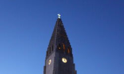 Nach dem Frühstück starten wir den Tag mit einem Fußmarsch zur Vermietstation unseres reservierten Leihwagens. Dabei kommen wir an den typischen kleinen nordischen Häuschen vorbei, die es hier gibt. Unser Weg führt auch an der berühmten Hallgrimskirche vorbei, die angestrahlt wird, weil es noch dunkel ist.