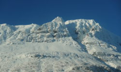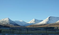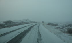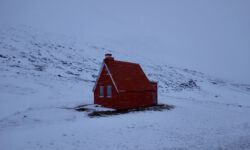 Der Weg an der Küste entlang zieht sich ganz schön und es fängt auch an zu regnen. Trotzdem finden wir die Landschaft sehr bemerkenswert. Wir fahren an lauter Tobleronebergen vorbei und bekommen Lust auf Schokolade. Plötzlich wird es immer weißer um uns herum und Regen wechselt zu Schneeregen. Die Straße wird ebenfalls weiß und wir müssen vorsichtig fahren. Dann schneit es und alles ist weiß. Ein kleines rotes Häuschen steht am Wegesrand im Schnee.