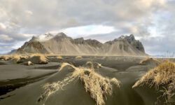 Klaus möchte gerne in Stokksnes halten, das liegt am Vestrahorn und wir müssen die Ringstraße verlassen, um fünf Kilometer weiter südlich am Viking Café anzuhalten. Dort müssen wir Eintritt bezahlen, damit sich die Schranke zu einem Privatgrundstück öffnet. Auf diesem Gelände gibt es neben einem alten Vikingerdorf einen schwarzen Sandstrand und ein paar Sandhügel mit Gras. Das hört sich erst einmal nicht soo spektakulär an und viele Besucher gibt es auch nicht, aber je näher man den Sandhügeln kommt, umso mehr entdeckt man die Schönheit dieses Fleckchens.