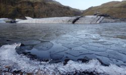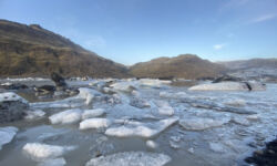 Wir fahren weiter durch die bizarre Landschaft. Links und rechts der endlos erscheinenden Straße finden sich Grassteppen, Lavagestein mit und ohne Moos, Islandponys, Berge mit und ohne Schnee, dicke Wollschafe, Flüsse und Bäche mit und ohne Eis, Aschewüsten, und Gletscher. Der näxte Halt ist am Naturreservat Skaftafell. Da gibt es einen Wasserfall, Svartifoss (schwarzer Wasserfall) und den Gletscher Skaftafell. Beide liegen weit auseinander, wir laufen daher nur zum Gletscher, wer weiß, wie lange es ihn noch gibt. Dort liegen wieder dicke Eisbrocken im Wasser, die weiß und blau schimmern. Das sieht vor der Bergkulisse wirklich grandios aus.