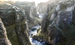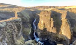 Das näxte Ziel ist die Federschlucht Fjadrargljufur, eine 100 Meter tiefe und zwei Kilometer lange Serpentinenschlucht, durch die der Fluss Fjardra fließt. Wir haben spektakuläre Einblicke in die Schlucht von oben, da dort ein Fußweg entlang führt. Gute Fotos sind zum Teil schwierig zu schießen, wenn sie gegen die Sonne gemacht werden müssen, aber wir wollen uns nicht über den wunderbaren Sonnenschein beschweren. Ansonsten sieht die Schlucht zusammen mit dem Wasserfall sehr beeindruckend aus.