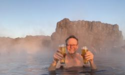 Dann fahren wir zu den Myvatn Natural Baths. Das ist eine Badelandschaft, die aus mehreren Becken mit unterschiedlich warmem mineralischem Wasser zwischen 36 und 40 Grad bestehen. Darauf freue ich mich schon seit Tagen sehr. Selbst Klaus, die Landratte, kommt mit. Es ist wunderbar warm im Wasser und es gibt eine kleine Bar im Wasser, an der wir uns ein Bier gönnen. So lässt es sich aushalten. Nach zwei Stunden haben wir schrumpelige Finger und gehen zurück zum Parkplatz.