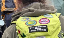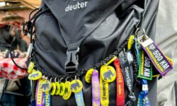 Leider ist der Wetterbericht immer noch schlecht. Es ist ziemlich viel Regen angesagt und im Moment tobt ein Schauer draußen. Den warte ich ab bevor ich mich auf den Weg zum Start mache. Dadurch wird es allerdings etwas spät und ich schaffe es nicht rechtzeitig in meine Startgruppe. Mit 5 Minuten Verspätung rolle ich das Feld von hinten auf und laufe erst einmal ziemlich schnell mit einem Essener Feuerwehrmann, der mir schon mal verrät, dass es später hoch zum Tetraeder 368 Stufen sind. Irgendwann läuft er schneller und ich treffe auf ein Mammut mit einem Patch auf dem Ruxsack: „Bad decisions make good stories“. Das gefällt mir, ich spreche sie an und wir laufen einige Kilometer zusammen bis sie am Verpflegungspunkt anhalten will.