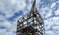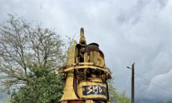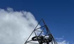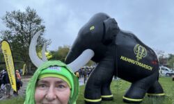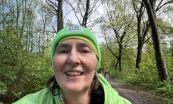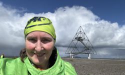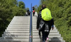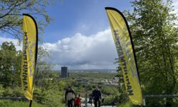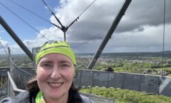 Kurze Zeit später treffe ich Julia aus Gießen. Es passt mit unserer Geschwindigkeit und wir finden viele Gesprächsthemen, so dass die Zeit zusammen mit den Kilometern recht schnell verfliegt. Wir laufen von da an bis zum Ziel zusammen. Das Wetter ist kalt und es regnet immer mal wieder, aber zum Glück ist es kein Dauerregen und auch kein starker Regen. Es gibt immer mal wieder Schauer und dazwischen sonnige Abschnitte. Daher laufen wir in Regenkleidung bis kurz vorm Ziel. Nach 38 Kilometern kommt die berüchtigte Treppe rauf zum Tetraeder. Wir schnaufen die 368 Stufen hoch, ganz oben werden wir mit Jubel und Mammutgummibärchen belohnt.