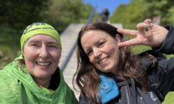 Auf den letzten Stufen krampfen meine Füße wieder leicht und ich trinke schnell etwas von meinem Elektrolytewasser, das sich in meiner Flasche befindet. Das reicht offenbar nicht und ich kann so nicht gut weiterlaufen. Julia findet ihr Magnesium nicht und ich spreche einfach die drei Jungs hinter uns an und frage, ob sie Magnesium dabei haben. Haben sie nicht, dafür Traubenzucker. Das begeistert mich nicht, aber ich bekomme den Befehl sofort einige Traubenzuckertafeln zu essen, dann hören die Krämpfe sehr schnell auf. Naja, kann ich ja zumindest versuchen. Ich esse vier von den ekelhaft süßen Dingern und fünf Minuten später sind die Krämpfe weg. Unglaublich! Hatte der doch tatsächlich recht. Jetzt können wir wieder die übliche Geschwindigkeit aufnehmen.