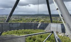Endlich können wir das Tetraeder in der Sonne leuchten sehen. Ich schlage Julia vor, etwas ganz Verrücktes zu machen und das Tetraeder hochzugehen, obwohl das natürlich nicht zum Marsch gehört. Sie winkt ab, aber ich möchte sehr gerne rauflaufen. Die paar zusätzlichen Stufen machen den Kohl heute auch nicht fett. Ich schlage Julia vor, dass sie weiterläuft und wir uns dann im Ziel sehe, aber sie will auf mich warten und nimmt auf einer Bank Platz. OK, dann kann ich ohne meinen Ruxsack hoch und beeile mich. Schon beim Erklimmen der Stufen nach oben merke ich wie meine rechte Wade etwas krampft und der linke Fuß ebenfalls. Ich werde langsamer und es geht wieder ganz gut. Oben angekommem habe ich einen fantastischen Rundblick über das Ruhrgebiet und die Sonne lacht ebenfalls. In der Ferne sehe ich aber schon den näxten Schauer auf uns zukommen, daher beeile ich mich nach unten zu kommen.