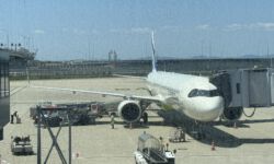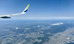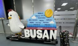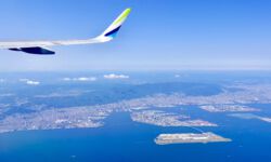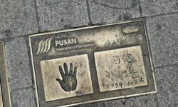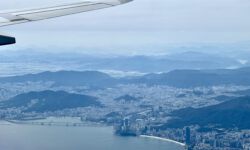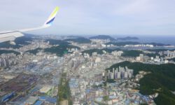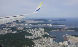 Heute morgen bringt uns Yannic zum Flughafen. Wir fliegen mit Air Busan von Osaka nach Busan. Seit vierzig Jahren gibt es den Airport in Osaka bereits und es ist bis heute noch nicht ein einziges Gepäckstück verloren gegangen. In Busan werden wir von Taesub empfangen. Er ist unser Guide für die nächste Woche. Taesub ist halb Koreaner und halb Japaner, wohnt in Deutschland und arbeitet mit Yannic in derselben Reiseagentur zusammen. Der Flug dauert nur eine Stunde und ich bekomme einen Fensterplatz. Ich kann Japan von oben sehen und auch die Küste von Südkorea, an der wir entlang fliegen. Je näher wir an Busan heranfliegen desto besser erkennt man die total zerklüftete Struktur. Es gibt viele Berge und dreieinhalb Millionen Einwohner. Da kaum Fläche vorhanden ist, hat man sehr viele sehr hohe Wohnblocks an die Berge gesetzt.