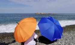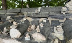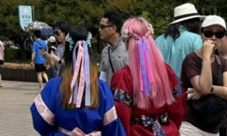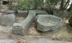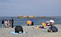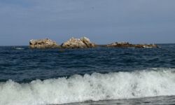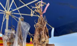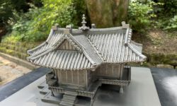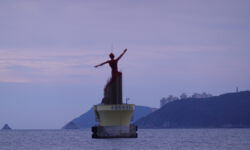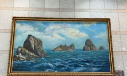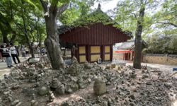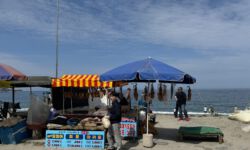 Wir sehen uns am Strand die Steine an, die das Grab und den Wasserdrachen darstellen und wir sind hier nicht alleine. Noch so manche andere Touristen sehen aufs Meer mit den Steinen. An den Buden auf der Strandstraße kann man getrocknete Fische oder Algen kaufen, um dem toten König zu huldigen, indem man die getrockneten Fische zurück ins Meer gibt. Die Schamanen halten hier sogar Totenrituale am Strand ab.