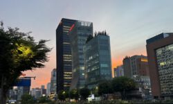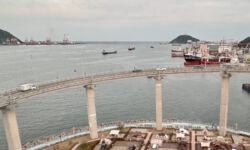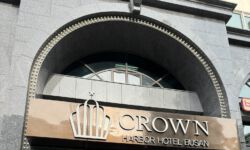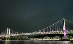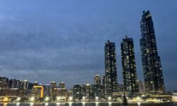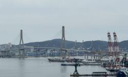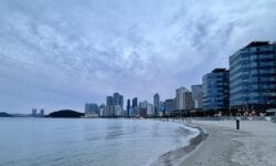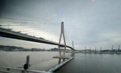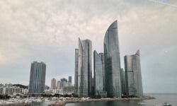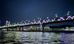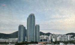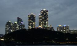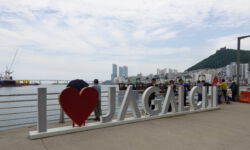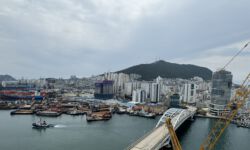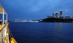 Nach der Einreise hole ich Geld am Automaten. Hier wird man schnell zum Millionär, denn 1 Million Won entsprechen 670 Euro. Wir fahren wir mit Taesub zum Hotel und checken ein. Dann treffen wir uns in der Lobby und es geht mit dem Bus zum Haeundae Beach, von wo aus wir mit einem Ausflugsboot bis zur Gwanban-Brücke fahren. Die Anreise über die Busan Harbour Bridge ist etwas abenteuerlich, denn sie führt über einen Zubringer, der in einem Kreis auf Brückenhöhe geführt wird. Unten liegt, sehr idyllisch, ein Campingplatz.